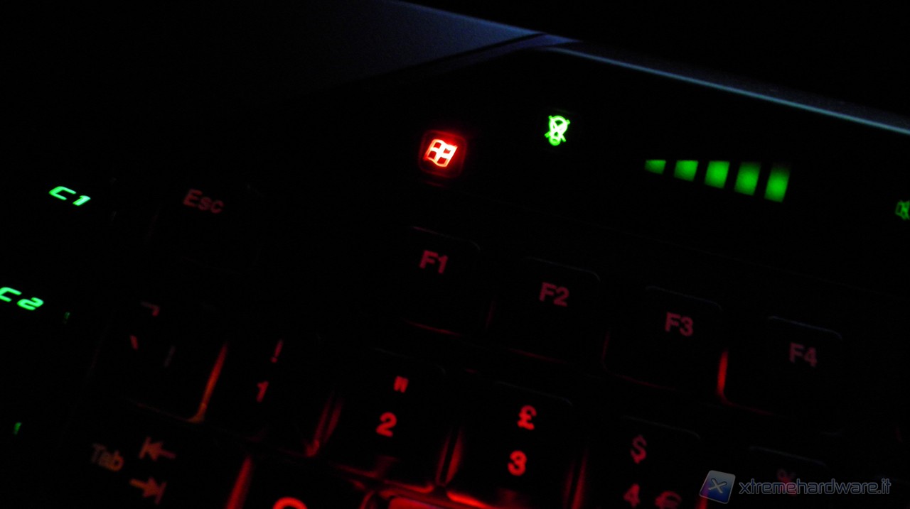 La modalità gaming permette anche di controllare in modo indipendente le aree illuminate, oltre a disabilitare il tasto per il menu start di Windows. Le aree sono in tutto cinque, partendo da sinistra abbiamo quella dedicata ai Cyborg Keys C1-C6, insieme a quella destra C7-C12, il blocco WASD, l'area che comprende tutti i tasti nella parte destra, i Function Keys e i tasti sopra ai direzionali, i direzionali, il tastierino numerico.