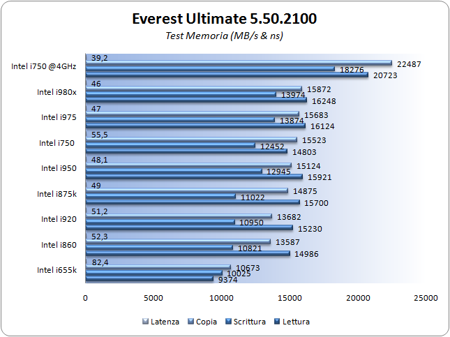 Abbiamo misurato la capacità in lettura, scrittura, copia e latenza per la memoria
