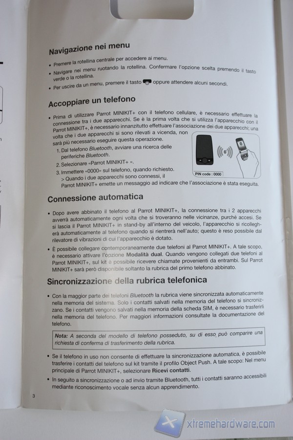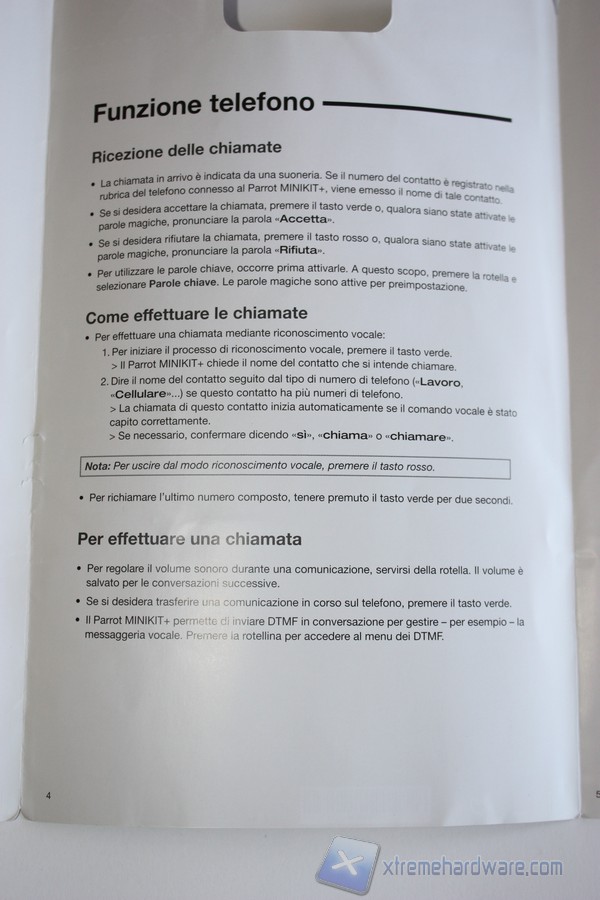 A seguire illustriamo le pagine che compongono la Guida d’uso al Parrot MINIKIT+.La Guida d’Uso è in Italiano e ci illustra nonché riassume in pochi semplici passi le funzionalità principali del Parrot MINIKIT+. La guida risulta essere facilmente consultabile da chiunque senza problemi.